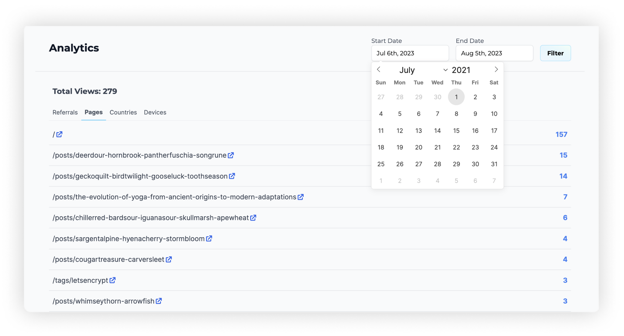 Get access to analytics, so you never need to worry about adding Google Analytics or any other tracking service. Say goodbye to intrusive "cookie banners" and let your readers enjoy a seamless, uninterrupted experience.